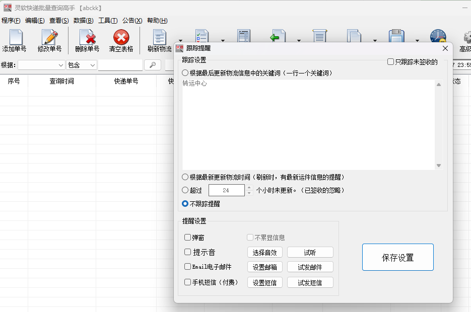 异常件处置的关键在于“及时”,灵软的跟踪提醒功能,可实现异常件实时预警,确保物流从业者第一时间发现异常、快速处置。软件支持开启跟踪提醒,一旦出现异常件,会实时弹出提醒窗口,同时可设置声音提醒,即便工作人员专注于其他工作,也能及时察觉异常。
