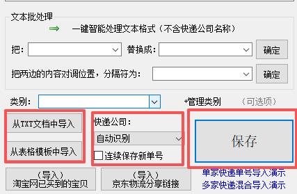 3、也可以从表格或者文档中一键导入物流单号,软件会自动识别快递公司,最后再点击保存。