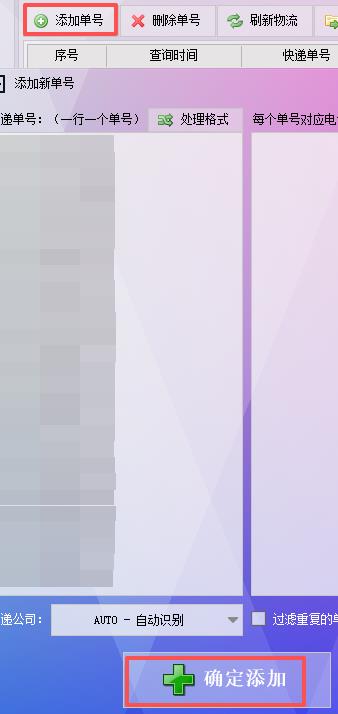 3、点击“添加单号”,导入需要查询的快递单号,再点击右下角“确定添加”。